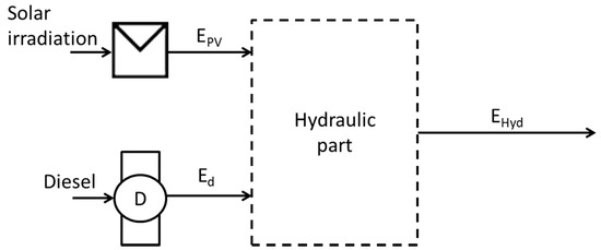 where EPV and Ed are the energy supplied by the PV generator and the diesel generator, respectively, EHyd is the hydraulic energy, and ηHyd is the efficiency of the hydraulic system. The following comments apply.