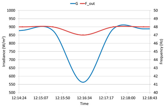 • once the fall in irradiance is detected, the PID controller is switched-off and power regeneration in the centrifugal pump is produced by reducing its frequency to keep the DC-bus voltage of the FC stable. This avoids any abrupt stop of the FC since it eliminates the occurrence of undervoltage errors; and