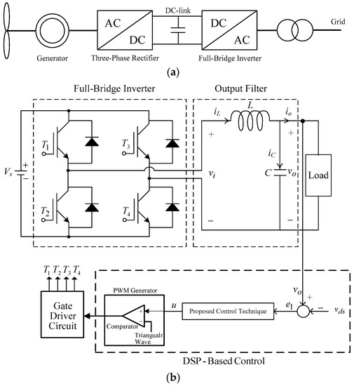 (a) Block diagram of a wind energy conversion system; (b) Full-bridge inverter and its controller.