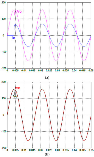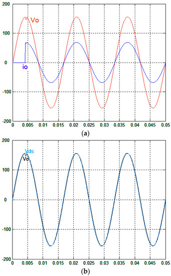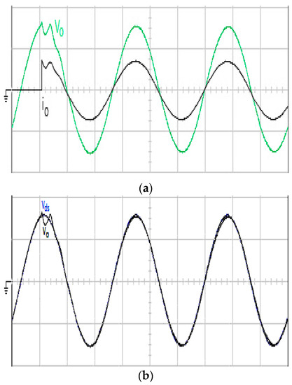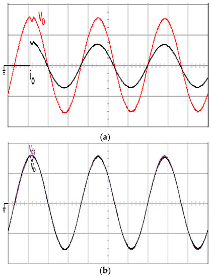 (a) Experimental waveforms of the output voltage and output current under step load change for the proposed control technique (100 V/div; 20 A/div; 5 ms/div); (b) Trajectories of output voltage and reference sine wave (100 V/div; 5 ms/div).