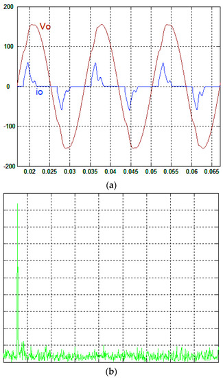 (a) Simulation waveforms of the output voltage and output current under nonlinear load for the proposed control technique (100 V/div; 20 A/div); (b) Harmonic spectrum of output voltage.
