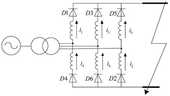 A schematic diagram of pole-to-pole faults in MMC-HVDC is shown in Figure 1. The fault process can be divided into two states. (1) Transient state: When the fault occurs, the DC voltage drops rapidly and the capacitors in the sub-modules discharge, leading arm current to rise. Then, the MMC is blocked after milliseconds [16], and the capacitors are bypassed to prevent the insulated gate bipolar transistors (IGBTs) from being damaged by the rising arm current. The blocked MMC is equivalent to a three-phase uncontrolled rectifier, as shown in Figure 2. The arm current in (n = 1, 2, …, 6) attenuates as the capacitors are bypassed, leading to the un-periodic conduction of diodes Dn (n = 1, 2, …, 6). The variation of fundamental frequency current shows non-periodicity. (2) Steady state: When the attenuation process of the arm current is finished, the steady state begins. In this state, the diodes conduct periodically, consequently, the variation of fundamental frequency current shows periodicity. The steady state will last until the AC circuit breaker operates.
