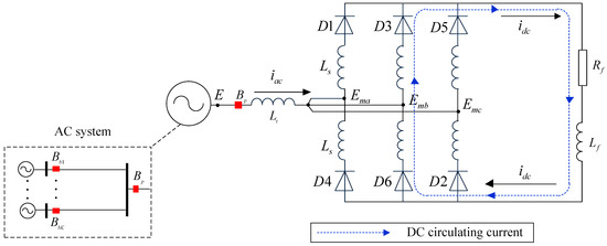 The AC system feeds the fault current through the uncontrolled rectifier continuously. However, this uncontrolled rectifier is different to the conventional uncontrolled rectifier due to the existence of arm reactors [22]. The arm reactors can participate in the power exchange between the AC and DC sides, rendering diodes in both the upper and bottom arms to conduct simultaneously, thus forming the DC circulating current, as the blue dotted line in Figure 4.