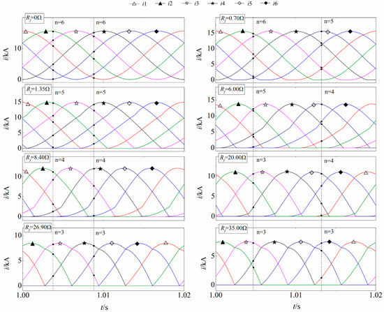 To meet the requirements of the selectivity and sensitivity of AC system backup protections in all reasonable cases, the setting calculation is usually based on the most severe conditions. From the selectivity point of view, the most severe condition corresponds to the highest fault current under Rf = 0. This is the three-phase circulating state and the fault current can be calculated precisely. From the sensitivity point of view, the most severe condition corresponds to the lowest fault current under the largest Rf, when the fault occurs at the remote ends of the DC line. If the largest Rf is between two adjacent critical resistances, the expression of the critical state corresponding to the lower limit of the simulation result could be applied in the setting calculation. If a more precise result is needed, the approximated Equations (19) and (21) could be applied in the setting calculation.