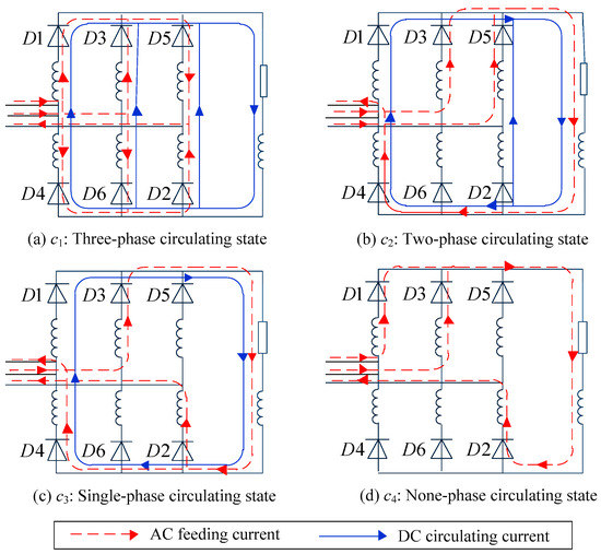 In the following analysis, the conducting sets {D1,D2,D3,D4,D5,D6}, {D1,D2,D3,D4,D5}, {D1,D2,D3,D4} and {D1,D2,D3} are selected for the three-phase, two-phase, single-phase, and none-phase circulating states, respectively. Their current loops are shown in Figure 7.