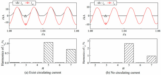 The AC current iac is correlated with the arm current in. Figure 8 shows the comparison between AC current iac and arm current in, and the fundamental frequency harmonics component analysis of iac. It illustrates that: (1) the peak value and phase of iac and in are the same, regardless of whether the DC circulating current exists; and (2) the harmonic component of iac is negligible. Thus, the peak value and phase of fundamental frequency current are considered to be the same as the arm current in regardless of the harmonic component.
