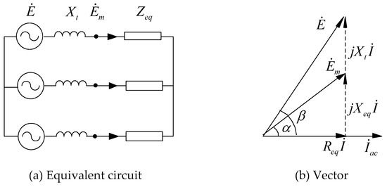 Since the mid-arm voltage Em is unknown while the AC source voltage E is already known, Equation (15) is rewritten as Equation (16). The equivalent circuit is shown in Figure 9, where Xt is the reactance of the transformer, and β is the phase lag of iac to E.