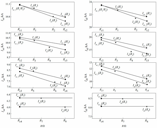 For any given fault resistance Rf, with the adjacent critical resistances of Rci and Rc(i+1), its corresponding expressions of fault current for adjacent critical states are Iac/dc_i(Rci) and Iac/dc_i+1(Rc(i+1)). Substituting Rf into Iac/dc_i(Rci) and Iac/dc_i+1(Rc(i+1)), the two calculation results Iac/dc_i(Rf) and Iac/dc_i+1(Rf) are obtained and drawn as squares in the resistance–current graph. The simulation results Iac/dc(Rf) under fault resistance Rf, are drawn as asterisks in the same graph and compared with the calculation results. Eight given fault resistances Rf (f = 1, …, 8) are selected and the comparison is shown in Figure 10. Iac/dc_(1,2,3,4)(Rf) is the fundamental frequency current or DC current calculation result obtained by the expressions for three-phase, two-phase, single-phase, and none-phase circulating states, respectively.