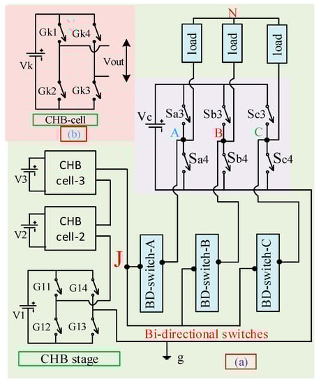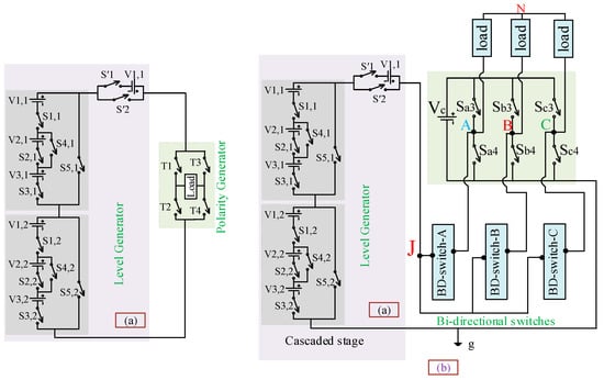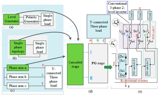 Figure 1d shows the block diagram of the proposed three-phase CMLI, in which a cascaded stage is connected with the polarity generator (PG) stage at junction point ‘J’. The structure of the cascaded stage is not fixed as it can be replaced by any existing cascaded MLI topology. The green shaded portions of existing CMLI topologies in