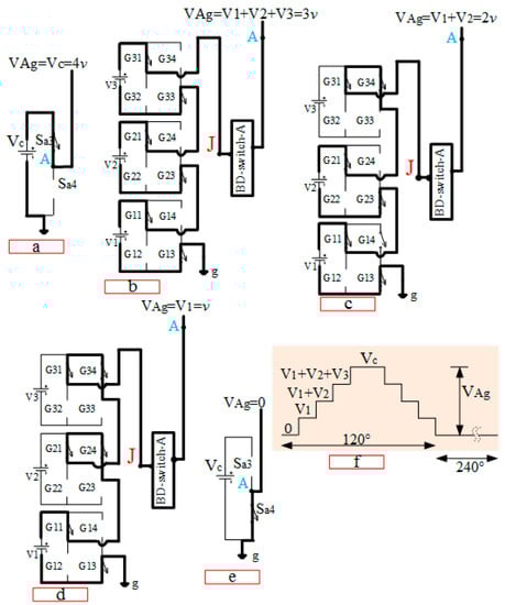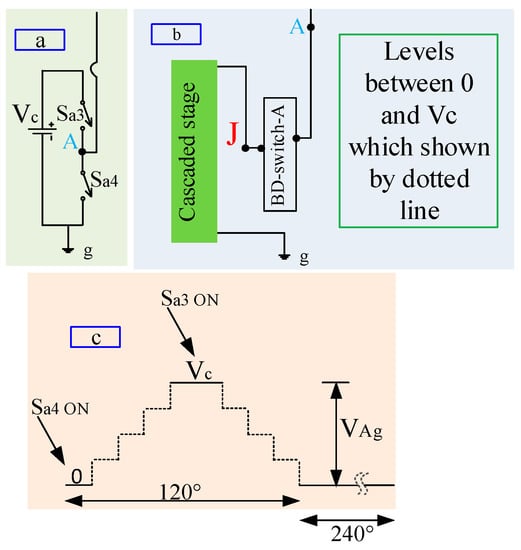 Figure 1a–c can be employed as a cascaded stage in the new proposed topology. The PG stage is developed by utilizing three Bi-directional (BD) switches and a conventional three-phase two level inverter (CTPTLI). Each BD switch consists of two insulated gate bipolar transistors (IGBT) and two diodes. Both IGBT switches work simultaneously to turn the BD on or off. Three-phase arms A, B, and C exist in the PG stage. A BD switch and two switches in the CTPTLI can be considered as a PG cell in each phase arm with 120° phase difference among the switching devices of the three cells. The CTPTLI is fed by a dc-voltage supply ‘