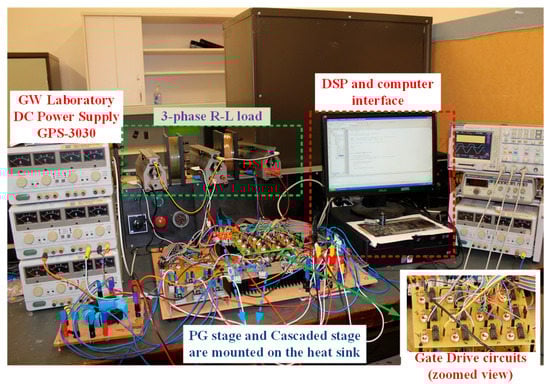 The real time switching signals are obtained using digital signal processor, TMS320F2812 (Texas Instruments, Dallas, TX, USA). The implementation requires 12 IGBTs for three CHB cells in the cascaded stage and 12 IGBTs in the PG cells. A laboratory prototype is developed to validate the feasibility of the proposed inverter.