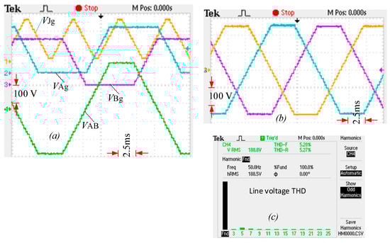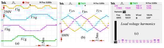 Six IGBTs, IRG4BC40W, 600 V/20 A along with six diodes, RHRP1540, 400 V/15 A are used for the three BD-switches in the PG-stage while 18 IGBTs, HGTG20N60B3D, 600 V/40 A are used to build the CHB cells in the cascaded stage and CTPTLI. A four channel digital storage oscilloscope, Tektronix TPS 2014 (Tektronix Inc., Beaverton, OR, USA) is utilized to capture the experimental output waveforms and analyse total harmonic distortion (THD).
