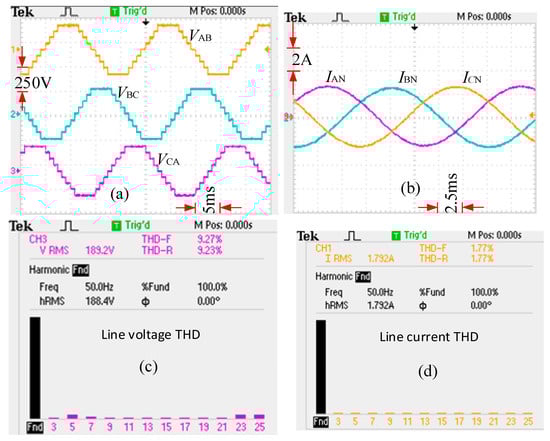 Figure 9c,d, respectively. The THD of the line current and voltage must be less than 5%, to comply with the IEEE standard [