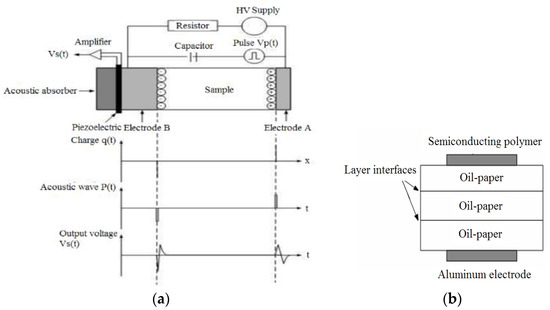 Pulsed electroacoustic (PEA) measurement principle and the measured sample. (a) PEA method principle; (b) sample arrangement.