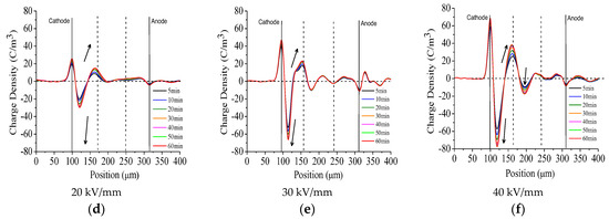 Space charges trapped in the oil impregnated insulation paper with new and aged oil under DC 20 kV/mm, 30 kV/mm, and 40 kV/mm. (a) sample with new oil (20 kV/mm); (b) sample with new oil (30 kV/mm); (c) sample with new oil (40 kV/mm); (d) sample with aged oil (20 kV/mm); (e) sample with aged oil (30 kV/mm); (f) sample with aged oil (40 kV/mm).