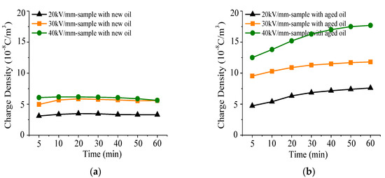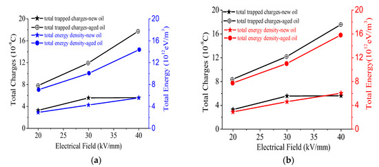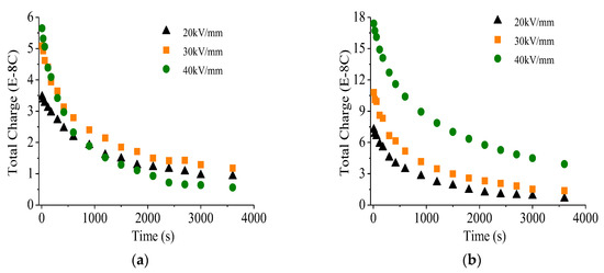 The total amount of trapped charges in the oil impregnated insulation paper with new and aged oil under volt-off condition is shown in Figure 3a,b, whether it is sample with new oil or aged oil, the total amount of charges trapped increases with enhanced electric field strength. For the sample immersed with new oil, the physical and chemical defects is limited, the traps could be fully filled when the voltage applied only for a while (Figure 3a). Thus, the amount of charges trapped in the sample shows a little increasing trend at first and then reaches saturation quickly with the voltage applied under 20 kV/mm, 30 kV/mm and 40 kV/mm, respectively. However, for the sample with aged oil, new physical and chemical defects were generated, which leads to the amount of trapped charges increases gradually, and it tends to attain a saturation value finally (Figure 3b). The saturation amount of trapped charges in the sample with aged oil is significantly larger than that in the sample with new oil under each applied electric filed. From Figure 3 it could be deduced that the saturation amount of trapped charges, and its increasing trend could reflect the changes in the material, which is related to the microscopic trap distribution.