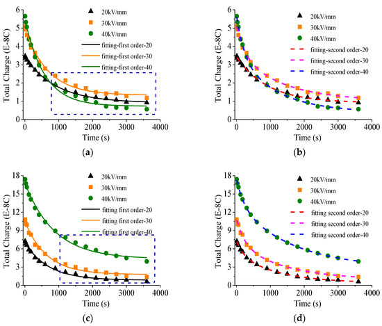 The charge detrapping process presented in Figure 5 was fitted using the first order exponential expression and double order exponential expression, respectively, as shown in Figure 7. The first order exponential fitting equations and the double order exponential fitting equations are shown in Table 2 and Table 3. As shown in Figure 7a,c and Table 2, the fitting curves obtained by the first order exponential fitting expression fit well with the measured data. However, in the middle and late stages of charge decay, some measured data deviate from the fitting curve. While for the fitting curves obtained by double order exponential fitting expression shown in Figure 7b,d and Table 3 is in good agreement with the measured data, especially in the middle and late stages of charge decay. This presents that the double order exponential fitting analysis accords with the law of charge dissipation, which includes the fast charge and slow charge. When compared with the common method, the improved method is more suitable for the kinetic analysis of charge detrapping.