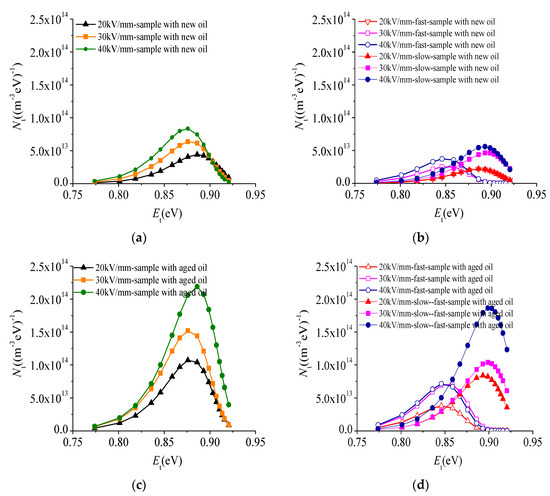 For the trap distribution of sample with new oil calculated by the common method, the energy level is from 0.77 eV to 0.92 eV (Figure 8a). With the electric field strength increased from 20 kV/mm to 40 kV/mm, the maximum trap density increases from 1.29 × 1012 m3·eV−1 to 8.36 × 1013 m3·eV−1, while the trap energy level corresponding to the maximum trap density decreases form 0.89 eV to 0.88 eV. For the trap distribution of sample with aged oil calculated by the common method, the energy level is from 0.77 eV to 0.92 eV (Figure 8c). The maximum trap density increases from 4.15 × 1012 m3·eV−1 to 2.19 × 1014 m3·eV−1 as the increasing of the electric field strength, and the trap energy level corresponding to the maximum trap density increases from 0.88 eV to 0.889 eV. In addition, the maximum trap density for the sample with aged oil is significantly higher than the sample with new oil. However, using the trap distribution obtained by the common method, it is difficult to know whether the increase in shallow trap or deep trap that is caused by oil ageing.