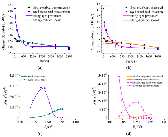 Figure 9c,d is the trap distribution calculated using the common method and the new method according to Table 1, respectively. The trap density for the aged pressboard is significantly higher than the fresh pressboard. However, it is difficult to know the increase degree of shallow trap or deep trap that is caused by ageing. In Figure 9d, it clearly shows the density of the shallow trap and deep trap both increases for the aged pressboard compared with the fresh pressboard. The results shown in Figure 9 further verify the effectiveness of the improved method.