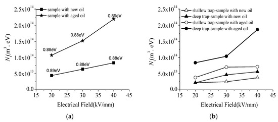 Trap density changing with electric field strength for the sample with new and aged oil was analyzed, as shown in Figure 11. It is worth noting that the trap density of the shallow traps and deep traps both shows an increasing trend with the oil ageing (Figure 9b), especially for the deep traps. The maximum trap density of the deep trap for the sample with aged oil under 20 kV/mm, 30 kV/mm, and 40 kV/mm is 8.38 × 1013 m3·eV−1, 1.04 × 1014 m3·eV−1, and 1.86 × 1014 m3·eV−1, respectively. While for the sample with new oil, the maximum trap density of the deep trap under 20 kV/mm, 30 kV/mm, and 40 kV/mm is only 2.20 × 1013 m3·eV−1, 4.64 × 1013 m3·eV−1, and 5.59 × 1013 m3·eV−1. The maximum density of deep traps for sample with aged oil is 3.81, 2.24 and 3.33 times larger than the sample with new oil under 20 kV/mm, 30 kV/mm, and 40 kV/mm, respectively. However, the maximum density of shallow traps for sample with aged oil is 1.73, 2.80, and 1.92 times larger than that for the sample with new oil under 20 kV/mm, 30 kV/mm, and 40 kV/mm, respectively. Thus, it is obvious that using the improved trap distribution calculation method, it is easy to know the degree of increase in shallow trap or deep trap caused by oil ageing.