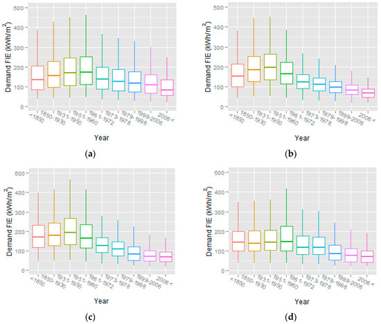 Heat demands in building category (a) 110 (Farmhouse and agricultural holding); (b) 120 (Detached single-family house); (c) 130 (Terrace, linked or double house (horizontal separation between units)); (d) 140 (A building of flats (A house for multiple families including two family housing (Vertical separation between units))).
