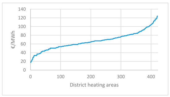 The heat prices used in the model are from December 2016 [36] and are shown in Figure 3. From the figure, it is clear that the prices vary among the 422 district heating areas in Denmark, from around 20 €/MWh to 120 €/MWh. This variation is mainly due to differences in heat supply and population density within each district heating area. In general, areas with a high density of buildings are better suited for district heating, and given access to inexpensive heat sources, such as excess heat from industries, electricity production, and waste incineration, the heat prices can be reduced significantly. The access to inexpensive heat sources even allows district heating to be feasible in areas with lower population density. Low density areas are however vulnerable to price changes, compared to areas with higher densities. A Danish study [37] of price differences made in 2012, concluded that what influences the prices in a district heating area is the primary fuel type used, the ownership of the system as well as scale of the system. However, the analysis also concludes that other factors should be analysed such as the size of the grids, consumer density, depreciation as well as age of the systems.