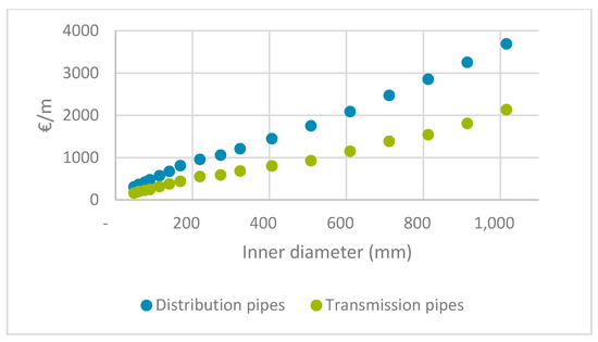 Investment costs of distribution and transmission pipes. Data from [38].