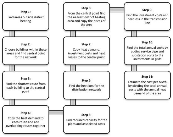 The GIS model consists of several Python scripts written for ESRI’s (Environmental Systems Research Institute) ArcMap software. The model attempts to estimate the heat price within towns that are not currently connected to district heating networks. Typically, this is done by manually determining the costs of building a new district heating network and connecting it to an existing area. The manual approach is highly labour intensive if carried out on a large scale, and thus, in the initial phase, a more automated process is useful to identify potential areas that warrant further analysis. This is where a screening tool, such as the one presented here, becomes relevant. However, it is important to remember that the final cost estimation still requires a more thorough approach, including a detailed dimensioning of the potential district heating network. Figure 5 shows the steps used to estimate the costs in the GIS model; these will be used in the following explanation of the model.