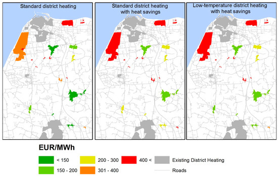 The total number of buildings in the northern region of Denmark that are connected to district heating is 152,979. The number of buildings that are located in towns but do not have district heating is 64,079; there are an additional 151,611 buildings located outside towns that do not have district heating. The only buildings included in this analysis are the 64,079 that are located in towns but do not currently have district heating. Figure 7 shows a part of the output of the GIS model. The existing district heating areas are shown as grey areas, while the potential areas are coloured from green to red, depending on the expected cost in €/MWh for supplying these areas. As described in the methodology, this cost is based on each potential area being connected to the nearest existing district heating area. Figure 7 shows the output for the same area for all three scenarios. It is evident that the expansion potential is largest in the standard district heating scenario. This is because the heat savings implemented in the other two scenarios influence the heat density in each area, which causes the investment costs to become relatively higher. Hence, in the scenario with standard district heating and heat savings, there are only a few remaining areas that offer low-cost expansion potential. In the scenario with low-temperature district heating and heat savings, this is improved slightly, as more areas have low costs.