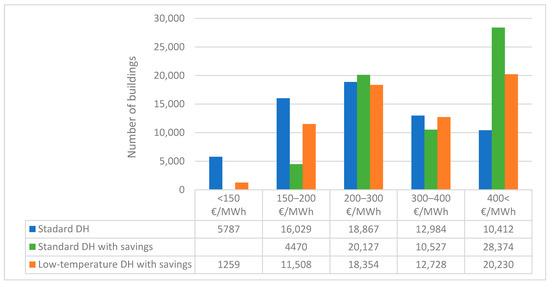 The maps shown in Figure 7 represent a small portion of the model output and do not include all of the analysed areas. In Figure 8, the whole area is included and presented as a column chart with the same cost categories as in Figure 7. The results clearly show that the expansion potential is cheapest in the standard district heating scenario, which has the highest number of buildings in the two cheapest price categories. Meanwhile, in the scenario with district heating and heat savings, there are no buildings left with a cost below 150 €/MWh, and only 4470 buildings remain in the price range between 150–200 €/MWh. Implementing low-temperature district heating increases this by a factor of three, with the total number of buildings in the two cheapest categories equalling 12,767.