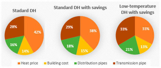 The composition of costs for each of the 1001 analysed areas varies considerably, as some have access to low heat prices from the nearest district heating system, some are denser and have lower investment costs for distribution grids, while others have low transmission costs. Therefore, the cost factor (or factors) that makes district heating feasible or not depends highly on the specific area in question. Nevertheless, the average cost in various categories is used as an indicator to see how the difference varies between the three scenarios; this is illustrated in Figure 9. The heat price on average has a 42% share of the total cost in the standard scenario; this drops when implementing heat savings and lowering temperatures. Instead, pipe costs have an increasingly more significant role, where the costs for distribution and transmission pipes increase from 16% and 28% in the standard scenario to 21% and 33% in the low-temperature scenario with heat savings.