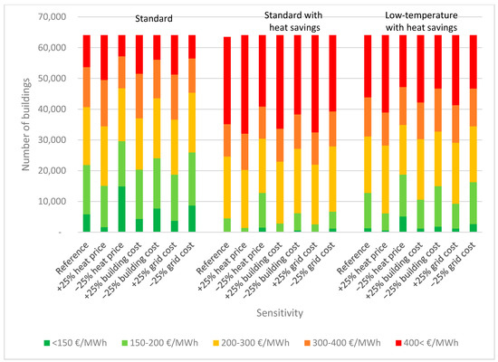 The sensitivity analysis shows that changing each of the three parameters does not change the fact that the standard scenario still ends up with the highest number of buildings at a price below 200 €/MWh. The sensitivity analysis also shows that the low-temperature scenario has buildings with prices below 150 €/MWh as well as in the 150–200 €/MWh category in all cases. Meanwhile, the standard scenario with heat savings performs similarly to the reference case, resulting in almost no buildings with a price below 200 €/MWh. However, when considering a 25% price reduction on any parameter, around 5000–12,000 buildings end up in the price range of 150–200 €/MWh for the heat savings scenario. In general, the sensitivity analysis does not change the overall results that district heating has the highest potential in the standard scenario, the lowest potential in the scenario introducing heat savings and a slightly better potential in the low-temperature scenario.