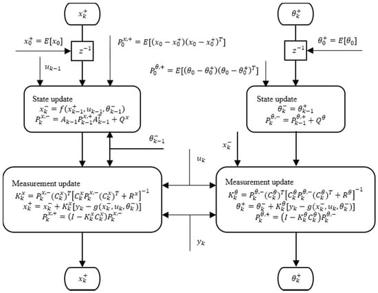 Assuming , Equations (8)–(10) can be used to calculate by an iterative process. Combined with the DEKF in Figure 2, the parameters and states can be estimated in real time.