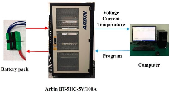 The test structure of the experimental system is shown in Figure 4, which consisted of an Arbin battery test system BT-5HC-5V/100 A, a battery pack, and a host computer. The test equipment BT-5HC-5V/100 A had 3 scales (100 A/10 A/1 A) and its operating voltage was 0–5 V. The resolution of the current and voltage was .