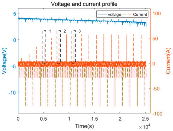 It can be noticed that the maximum constant charge current (2 C) pulses and minimum discharge constant current (−3 C) pulses were added to the profile to measure the true peak power of the battery pack. If the battery pack terminal voltage reaches the voltage limit in the constant pulse, the battery pack will operate at constant voltage. During the operation, the charge current pulses and the discharge current pulses were inserted every two SFUDS cycles.