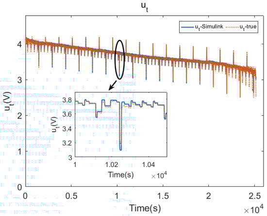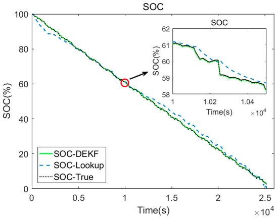 Taking the estimated value from Section 2.2.1 as the measurement value in Equations (21) and (22) and based on the DEKF algorithm in Figure 2, we can estimate the SOC value and the parameter vector . Similarly, assuming , by an iterative process Equations (8)–(10) can be used to calculate for estimating SOC.
