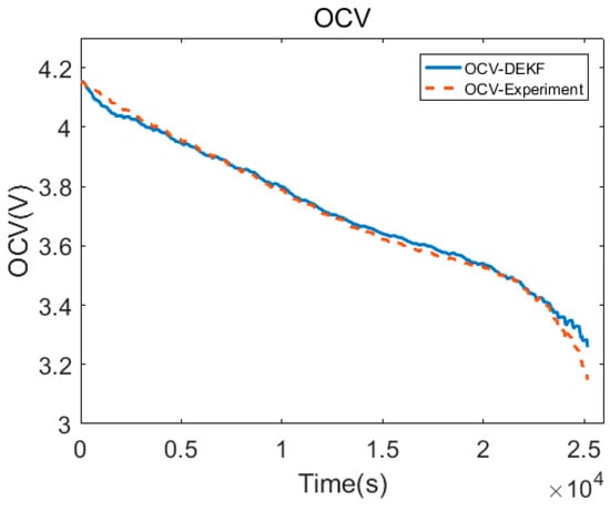 In Section 2.2.1, the open-circuit voltage has been estimated with DEKF. Although with the offline measured relationship we can find the SOC value, this method is not accurate enough because of the influence of aging and temperature on the relationship [15,41]. In addition, although SOC obtained by the relationship taking battery aging and temperature into account can be precise, extensive experiments are required [42,43]. Hence, in this section, a novel SOC estimation method based on open-circuit voltage and DEKF is proposed.