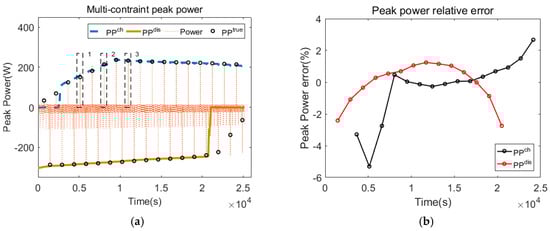 The peak power of every sampling time in the peak power state can be calculate by Equation (48). According to the rapid-calculating method proposed in Section 3.2, the peak power expression under dual current and voltage constraints of the whole peak power state can be obtained, as shown in Equations (49) and (50):