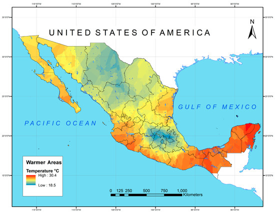 The population dynamics of Mexico’s coastal zones follow global trends, which indicate a movement of human populations towards these areas. In 2010, the population of the coastal states was 51,900,847 inhabitants, 4.5 million more than in 2005 and 7.25 million more than in 2000. It is expected that by 2030 it will increase to 55 million [36]. Warmer areas in Mexico usually are next to the sea, in the desert and rainforest. To identify the warmer zones in Mexico, temperature and relative humidity data were taken from [37] and they are presented in Figure 1.