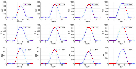 The output power and energy generated have been calculated with solar irradiance data recorded every 10 min from Automatic Meteorological Stations (AMSs) located at Coatzacoalcos [41]. Figure 2 shows monthly Global Horizontal Irradiance (GHI) over Coatzacoalcos (Veracruz, Mexico).
