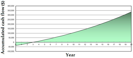 The SAPVS characteristics are: 12 modules of 310 W, a rated power of 3.72 kW and generating 5.41 MWh annually, an efficiency of 16%. A 0.505 tCO2/MWh of greenhouse gases (GHG) emission factor was obtained. Based on the power system, the reduction of net annual GHG would be 11 tCO2 and a financial revenue of 36.951 × 103 $/tCO2 would be obtained. Financial parameters such as an Internal Rate Return (IRR) of 36.3%, simple payback of 3.4 years and equity payback of 3 years show the financial viability in this investment; simple payback represents the length of time that it takes for a proposed project to recoup its own initial cost, out of the income or savings it generates and equity payback represents the length of time that it takes for the owner of a project to recoup the initial investment (equity) out of the project cash flows generated. In Figure 4 we can see the cash flow during the service life of the project.