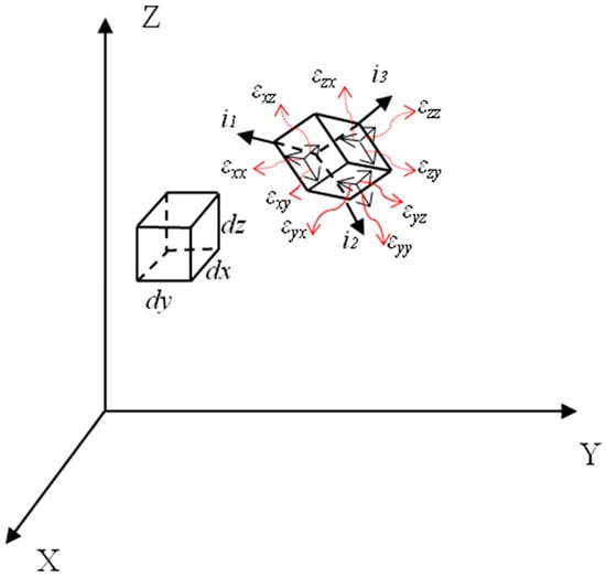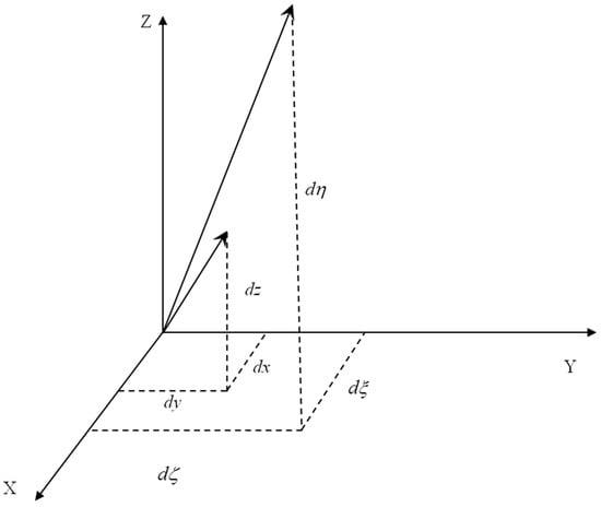 where the integration extends over the volume of the body in its unstrained state, as dxdydz is the volume of an elementary parallelepiped in that state. The function Φ(a2, a1, a0) is the strain energy of a unit volume of the body in its unstrained state, specific strain energy. To calculate all of the possible induced energy inside the entire element due to the different deformations in the different directions, the application of the principle of virtual displacement to a deformed body in a state of equilibrium is considered. The arbitrary vectors including , and were assigned to the displacements and dξ, dζ, dη are virtual displacement (Figure 2), respectively, which can be considered as arbitrary continuous functions of x, y, z equal to zero at those points where the values of the displacement are known.