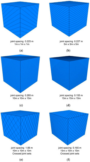 A quasi-static loading as a velocity was applied on the top and bottom of the model. The velocity slowly applied to the model to represent a relatively loading system to promote a model of a coal failure that progresses gradually. Simulating the acceptable loading condition is significantly important to soundly obtain a better understanding of the structural performance of a single coal mass the quasi-static loading conditions. No boundary and restrain conditions were applied around the lateral sides of the simulated cubes. Figure 6 illustrates a typical coal cubic sample with different density (a cubic coal sample ranging from 1 m × 1 m × 1 m to 15 m × 15 m × 15 m). As the number of the crossed joint sets increases, the role of the joint properties becomes more critical.
