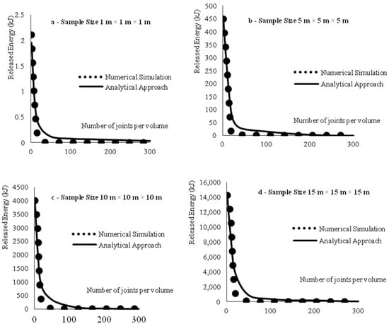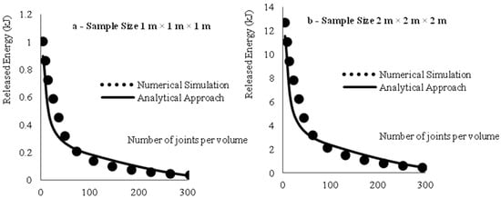 Figure 7 presents the estimated amount of released energy in different coal samples with different joint densities using both the analytical and numerical methods. As illustrated, there is a good agreement between the numerical and analytical solutions. As the number of joints increases, the amount of the released energy in the simulated coal samples significantly decreases. This is due to the effect of the physical and damping interaction between the engaged surfaces of the joints which creates an internal released energy. It is also found that by increasing the number of joints, the global integrity of the simulated samples is considerably reduced, which may lead to reducing the amount of released energy in the coal.