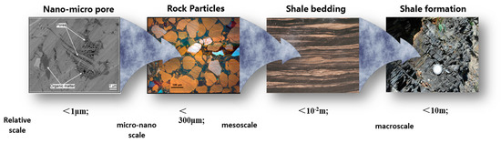 It has been commonly recognized that significant spatial heterogeneity, characterized by the multi-scale nature, extensively exists in shale reservoirs. The wetting properties and flow behavior of oil and gas change dramatically in different types of porous media. Cross-scale nano-micro porosity plays a dominant role in fluid storage, and micro-scale pore-throat morphology and connectivity strongly affected fluid transport phenomena. In addition, the fracture growth and the occurrence of natural fractures are extremely complex. Figure 1 shows multi-scale natural fractures, namely micrometer-scale (small scale), centimeter-scale (medium scale), and meter-scale (large-scale) fractures, co-exist in the shale reservoirs, of which the distribution pattern and occurrence both exhibit fractal features. Macro-scale favored flow areas are, accordingly, derived from the multi-scale connected/isolated natural fractures, localized accumulation of organic matter, and heterogeneous porous structure of shale reservoirs, which further affect the dynamic changes of pressures and fluid compositions in shale reservoirs. In addition, the complexity associated with reservoir, fracture, and fluid properties make various engineering techniques inaccurate to evaluate reservoir and fracturing properties of shales, such as sampling, well logging, and pressure-transient and rate-transient analysis [1,2]. However, compared with individual fractures, characterizing the complexity of multi-scale fracture networks still have many challenges.