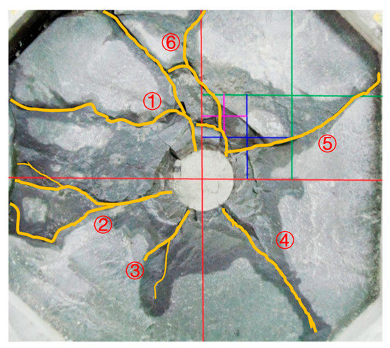 Core fracture network experiment result. A total of six cracks are generated after fracturing. ④ and ⑤ grow only single fractures perpendicular to the wellbore, but ①, ②, ③, and ⑥ split into two branches after propagating a few centimeters, modified from Guo et al. [18]