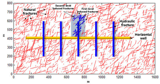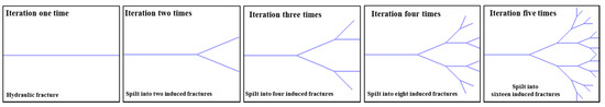 The fracturing treatment aims at creating the stimulated reservoir volume (SRV) to form the hydraulic fracture-natural fracture system [23,24,25,26]. However, without effective fracturing-forced propagation and openness, the natural fractures are very difficult to contribute to the production. Figure 3 shows a schematic plot of the fracture representative element volume (FREV), in which connected natural fractures and induced fractures are the main flow paths in the SRV, where permeability is much higher than the matrix. Given the process and relevant characteristics of the multi-stage hydraulic fracturing in unconventional reservoirs, the fractal fracture pattern is generated by construction theory [27] in Figure 4. Assumptions are made as follows: (1) Only the hydraulic fractures and natural fractures (including each level of induced fractures) connected with each other and isolated natural fractures are not considered. (2) Fractal fractures are generated hierarchically, and they are all perpendicular to the wellbore and grow by means of “bifurcation”. (3) Fracture properties stipulate in each level of the fractal fractures by scaling factors.