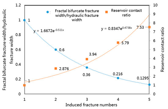 Fractal fracture width and reservoir contact area change with respect to induced fracture numbers.