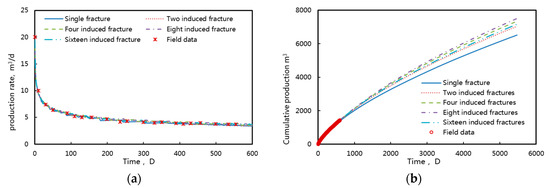 Fractal fracture network history matching combined with Changqing oil field data. (a) represent production rate with respect to different induced fracture scenario; (b) represent the cumulative production for all cases.