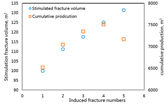 Stimulated fracture volume and cumulative oil production change with respect to induced fracture numbers.